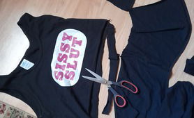 I bought a sissy top, but it was sooo long! I just had to shorten it! And I love my gogo panties and my pink fishnet tights.😇